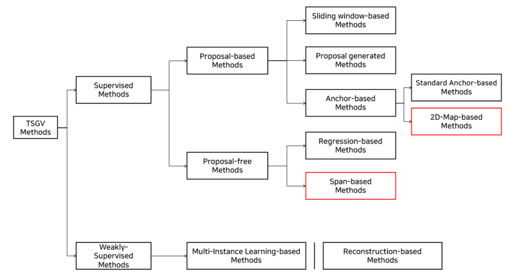 기본적으로 Fully-supervised 방법론과 Weakly-supervised 방법론으로 나눌 수 있습니다. Fully-supervised 방법론은 입력으로 video와 text query가 들어가고, 모델이 예측한 구간을 주어진 실제 GT 구간과 비교하며 학습합니다. 이와 다르게 Weakly-supervised 방법론은 video와 text query를 입력받는 것은 같지만, 해당 text query에 대한 GT구간이 주어지지 않은 채로 학습합니다. 이번 리뷰에서는 Fully-supervised 방법론들만 살펴보겠습니다.
