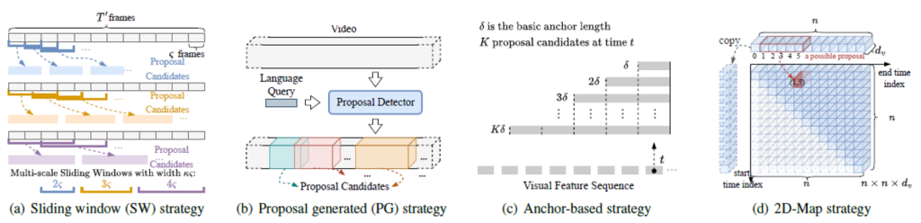 (a)는 가장 고전적인 방법으로, 다양한 크기의 window를 고정하고 비디오에서 sliding 하며 해당 window의 구간이 text와 잘맞는지 측정합니다.