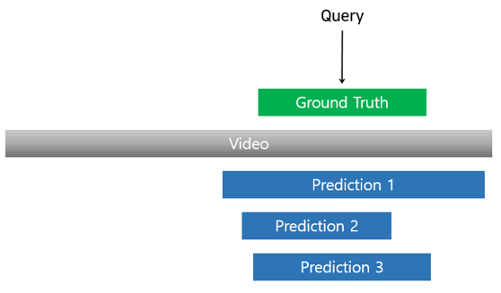 다들 잘 아시는 recall 개념이 사용됩니다. Recall@n, IoU@m은 모델의 예측 구간들 중 시간 축에 대한 GT와의 IoU가 가장 높은 n개를 봤을 때 그 IoU가 m 이상인 예측 구간이 하나라도 존재하면 해당 query는 positive로 보겠다는 것입니다. 모든 query에 대해 위 과정을 거쳐 모델의 성능을 측정합니다.