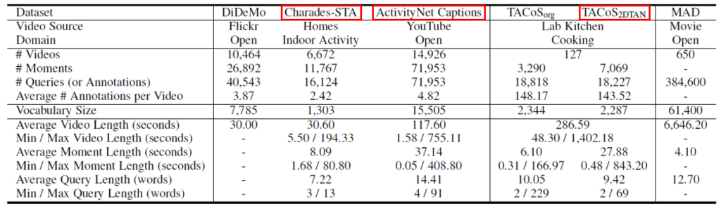 최근 21~22년도 논문을 보니 Charades-STA와 ActivityNet Captions 데이터셋이 벤치마킹에 사용되고, 논문에 따라 TACoS_{2DTAN} 데이터셋을 추가로 벤치마킹하는 경우도 있었습니다.
