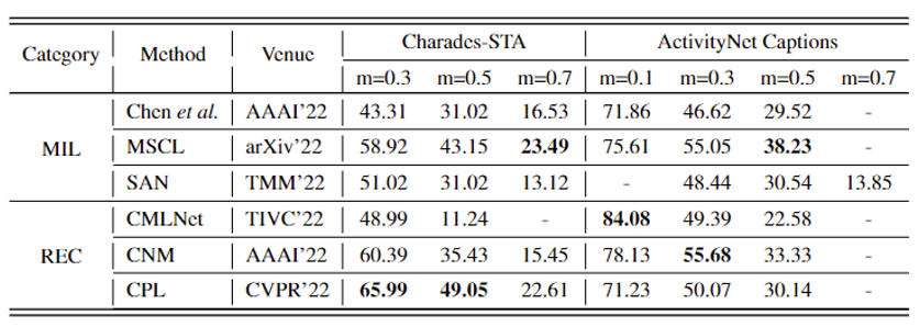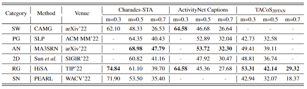 R@1, IoU@m. SW: Sliding Window, PG: Proposal-Generated, AN: Anchor-based, 2D: 2D Map-based, RG: Regression-based, SN: Span-based