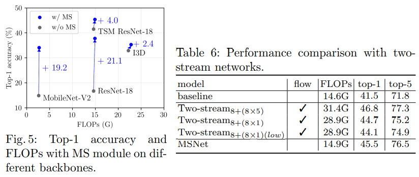 Abalation도 더 많은데, 모델 ablation은 이제 관심이 있으신 분들이 찾아보면서 보는게 좋을 것 같습니다. 리뷰에서 다뤄볼만한 부분으로는 MS module이 정말 여러 백본에 적용이 가능한가에 대한 실험으로 [그림 5]를 확인하면 되고, 다른 방법론이 아니라, 좀 더 직접적인 Two-stream과의 비교는 [표 6]을 확인하면 됩니다. Optical flow 자체가 flow를 여러개 쌓아서 사용하기 때문에, 공정한 비교를 보려면 “8+(8X1)”을 봐야한다고 하네요.