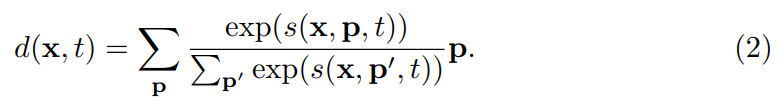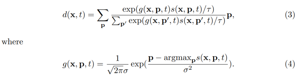 다음 단계는 motion 정보의 변위를 측정하는 단계입니다. 미분 가능하지 않은 방법으로 이 방법을 수행해보면 단순하게 \argmax_p s(x,p,t)와 같이 계산하는 영역에서 correlation이 최대값인 x의 위치를 사용하는 방식이 있습니다. (이 부분은 t와 t+1에서 픽셀 매칭을 했을때 유사도가 제일 높은 픽셀이 움직인 위치라고 볼 수 있다는 부분입니다.) 하지만 학습을 하려면 가중치가 흘러야하는데 미분이 안되면 E2E로 학습시킬 수 없겠죠? 따라서 여기서는 soft-argmax라는 방법을 이용해서, 가중 평균을 사용해서 변위를 추정합니다.