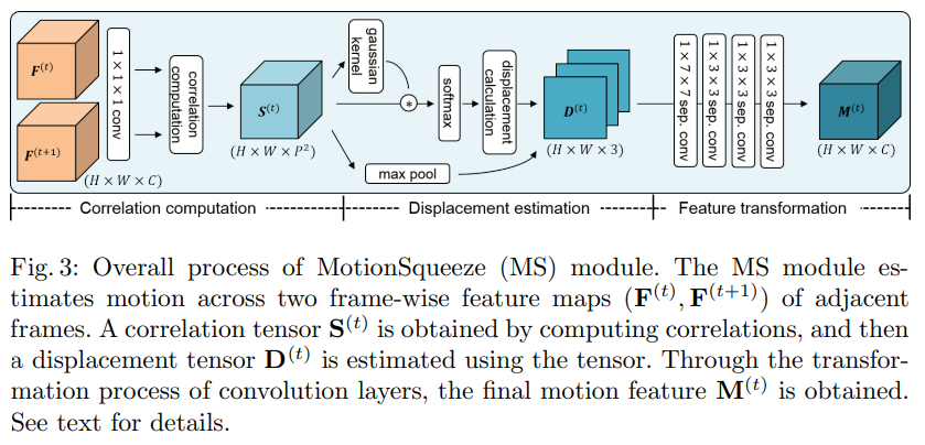 MS module은 motion feature extractor로 정의할 수 있습니다. 그림 2를 보면 대략적인 구조를 확인할 수 있는데요. 기존의 백본의 중간에 이렇게 끼워넣는다 정도로 생각하면 될 것 같습니다. 그럼 이 끼워 넣는 것에서 어떻게 motion 정보를 추출하는가… 그건 3단계(Correlation computation / Displacement estimation / Feature transformation)로 나눠집니다.