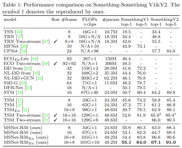 [표 1]은 기존의 SOTA 방법론과의 비교입니다. 주목해야할 부분은 FLOPS와 성능입니다. 기존의 optical flow를 활용하는 방법론이 체크표시된 방법론들인데요. 아무래도 two-stream 기반이다 보니 FLOPS가 높고 성능도 높은 것을 볼 수 있습니다. 이와 대응되는 방법론이 E_n이 붙어있는 MSNet인데요. 이건 16프레임 / 8프레임 간격으로 계산한 두 모델을 앙상블한 방법론인데요. 조금 더 빠르고, 높은 성능을 보이는 것을 볼 수 있습니다. 그리고 굳이 이렇게 앙상블 하지 않을 경우에는 훨씬 빠르고, 비슷한 성능을 보입니다.