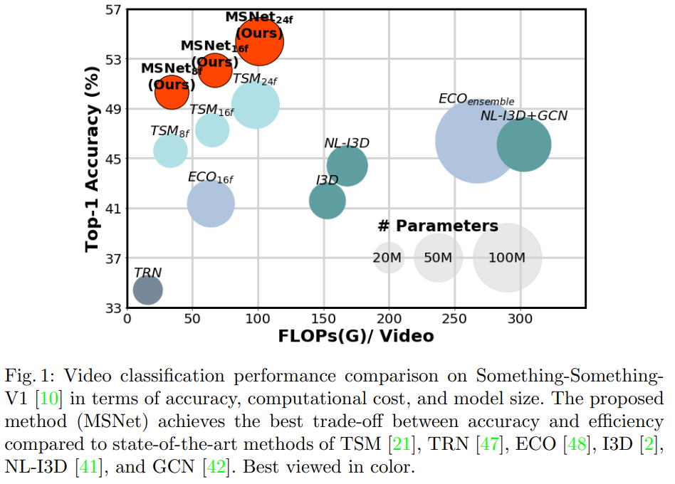 그래서 본 논문에서는 motion estimation이 가능한 E2E 학습 모듈, MotionSqueeze Module(이하 MS 모듈)을 통해서 이 문제를 해결했다고 합니다. 그림 1이 그 성능을 보여주는데요. MSNet은 우리가 알고있는 Resnet 백본에 여기서 제안하는 모듈을 붙인 네트워크인데요. 기존의 flow를 사용하는 모델보다 더 빠른 속도에 더 높은 정확도를 보여주는 것을 확인할 수 있습니다.