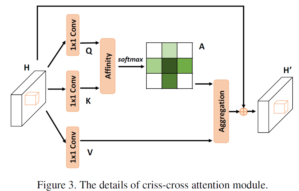 전체 구조에서는 위에서 설명한 거 처럼 Criss-Cross Attention Module 이 2번 사용되었는데,