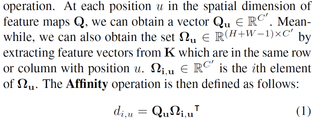 이 때문에 H’ 에 Criss-Cross Attention Module을 적용시켜서 H”을 구하게 됩니다.