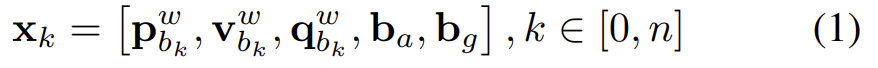 world frame은 \mathbf{W}, IMU body는 \mathbf{B}, LiDAR frame은 \mathbf{L}, camera frame은 \mathbf{C}로 표현합니다. 또한, 로봇의 k번째 상태\mathbf{x}_k는 아래의 식(1)로 표현되며, \mathbf{p}^w_{b_k}는 위치, \mathbf{v}^w_{b_k}는 속도, \mathbf{q}^w_{b_k}는 방향, \mathbf{b}_a\mathbf{b}_g는 각각 가속도와 자이로스코프의 bias를 의미한다고 합니다.
