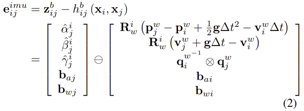 IMU preintegration 방식[1]에 의해 연속적인 i,j 사이의 상대적인 motion 측정값 \Delta \mathbf{r} = (\hat{\alpha}^i_j, \hat{\beta}^i_j, \hat{\gamma}^i_j) 을 얻을 수 있다고 합니다. IMU preintegration factor는 아래의 식(2)로 정의가 됩니다.