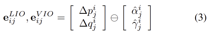 LiDAR와 카메라 odometry는 로봇의 초기 pose를 기반으로 pose를 local하게 알 수 있으므로, 상대 pose인 [\Delta p_j^i, \Delta q_j^i ]를 IMU preintegration의 위치 \hat{\alpha}^i_j와 rotation \hat{\gamma}^i_j의 제약조건으로 이용한다고 합니다. 또한, 그래프의 factor는 아래의 식으로 정의됩니다.