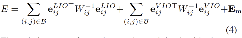상대 pose factor는 관측치의 신뢰성을 기반으로 계산이 가능하도록 하기 위해 가중치 W를 부여합니다. 이 가중치W는 시각적 성능이 저하된 환경에서는 VIO의 가중치가 낮아지고, 기하학적으로 저하된 환경에서는 LIO의 가중치가 낮아지도록 합니다.