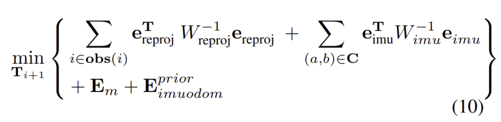 새로운 keyframe에 대하여 visual reprojection error \mathbf{e}_{reproj}, IMU preintegration factor \mathbf{e}_{imu}, marginalization factor \mathbf{E}_m으로 구성된 최적화를 진행하기 위한 수식은 아래와 같이 정의됩니다.