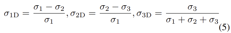 K-D tree 방식을 이용하여 구의 반경이 r에 해당하는 가장 가까운 k개의 neighbor point들을 찾습니다. 여기에 PCA를 적용하여 local linearity \sigma_{1D}, planarity \sigma_{2D}, curvatures \sigma_{3D}를 구하며, 이는 아래의 식으로 정의됩니다.