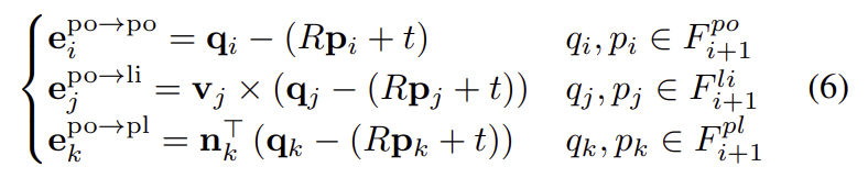 다음의 식(6)을 이용하여 point-to-point, point-to-line, point-to-plane의 오차를 한번에 최소화하여 최적의 변환을 예측한다고 합니다.