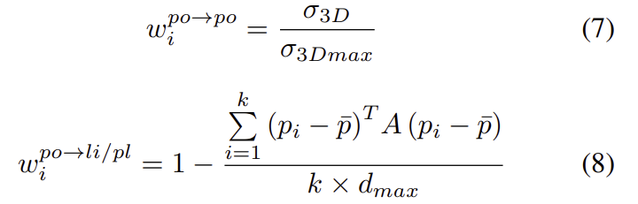 그러나, 먼지, 안개, 연기와 같은 공중 부유물에 의해, LiDAR로 얻은 기하학적 특징이 신뢰할 수 없다는 문제가 있습니다. 저자들은 추출된 형상의 주변 point가 점, 선 또는 평면 분포에 적합한지에 따라 대응점의 품질이 좌우된다는 것을 발견하였고, 분포의 품질 W_l = \{ w_i^{po→po}, w_i^{po→li}, w_i^{po→pl} \}은 아래의 식으로 정의하였습니다.