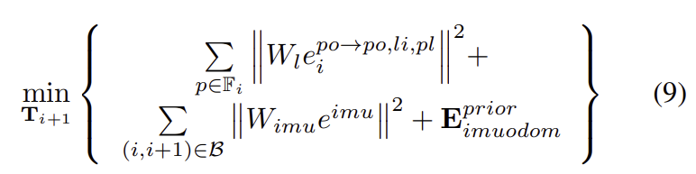 \mathbf{E}^{prior}_{imuodom}는 예측된 pose prior, \mathbf{e}^{imu}는 IMU odometry에서 구한 preintegration factor를 의미합니다. W_l, W_{imu}는 각각 LiDAR와IMU에 대한 가중치로, LiDAR의 입력을 신뢰하기 어려울 경우, LiDAR의 제약 조건의 품질 평가를 통해 낮은 가중치를 가지게 됩니다.