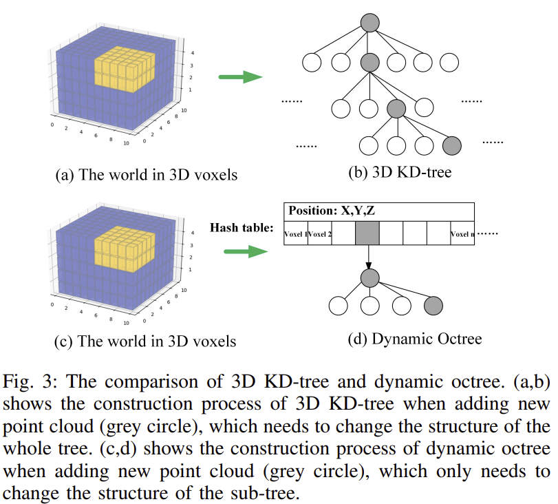 대부분의 LiDAR SLAM은 KD-tree를 이용하여 3D 포인트를 정리합니다. 저자들은 이러한 전통적 KD-tree 방식은 하나의 tree만을 사용하고, 새로 point가 추가될 때 마다 KD-tree를 다시 생성해야 하므로 시간이 너무 많이 소요된다는 문제가 있다고 주장합니다. 이를 해결하고자, dynamic octree라는 효율적인 방식을 제안하였습니다.