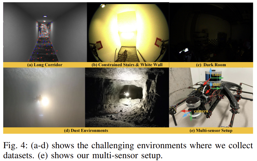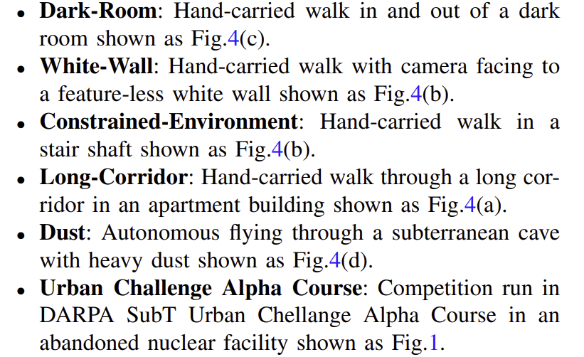 4. 드론이나 지상 로봇을 포함한 여러 환경에 이용하며, 강렬한 움직임, low-light, 긴 복도(structure-less), 심한 먼지와 같은 환경에서 평가를 진행함.