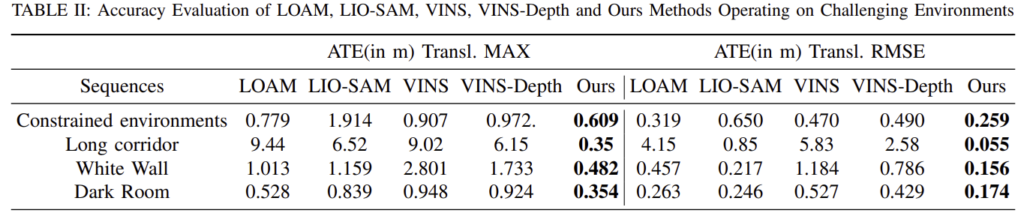 실험 결과는 아래의 TABLE Ⅱ를 통해 확인할 수 있습니다. LOAM과 LIOSAM은 LiDAR 기반의 방법론이고, VINS와 VINS-Depth는 Vision기반의 방법론을 의미합니다. 시각적/기하학적/시각&기하학적 degradation 상황을 고려한다고 합니다.