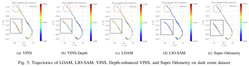 Dark Room에 해당하며, 어둡기 때문에 시각적 정보를 얻기 어렵습니다. Fig. 5가 궤적을 시각화한 것으로, vision기반의 방법론인 VINS에서 가장 안 좋은 결과를 보이고, 이는 표에서도 확인할 수 있습니다.
