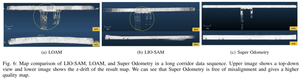 Long-Corridor에 대한 결과로, 이러한 시나리오는 건물 내부와 같은 인공적인 환경에서 흔하며, 반복적인 구조는 LiDAR 기반 알고리즘에서 문제가 될 수 있습니다. Fig. 6이 결과 Map을 시각화 한 것으로, LOAM과 LIO-SAM에서 드리프트가 발생한 것을 확인할 수 있습니다.(각 방법론의 1행 이미지들은 위에서 바라본 영상으로, 아래로 뻗어나온 점들 Super Odometry와 유사한 결과가 나와야 하는 데, (a)와 (b)는 포인트들이 잘 정렬되지 않은 결과가 나온 것으로 보입니다. 그런데 GT map을 같이 보여주지 않아서 이게 잘 나온 것인지는 판단이 잘 되지는 않습니다.. )