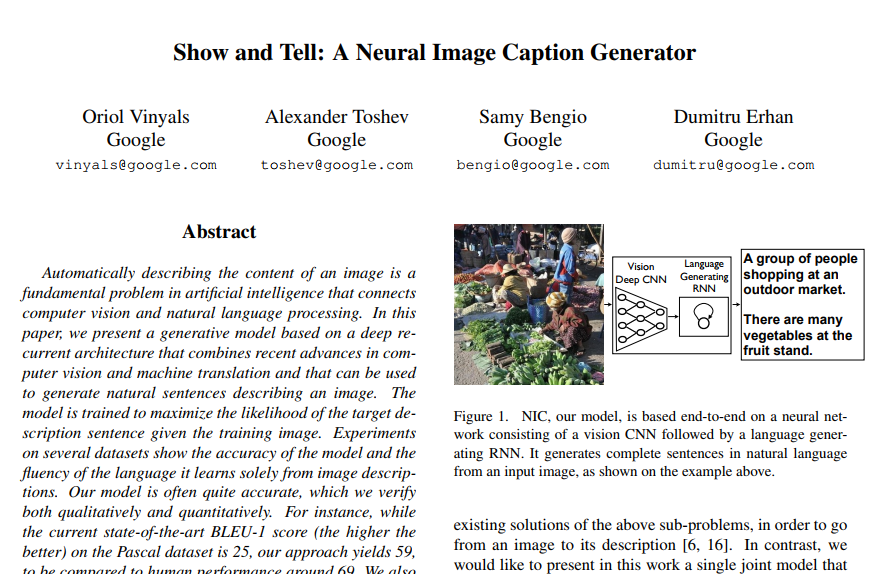 안녕하세요. 이번에는 2015년에 Google에서 발표한 논문을 가져와 봤습니다. 이번 학기에 수강하고 있는 수업에서 이미지 캡셔닝이 언급되어서 궁금하여 읽어보게 되었습니다. 이미지 캡셔닝 분야에서는 Show and Tell 논문이 가장 유명한 논문이라고 합니다.