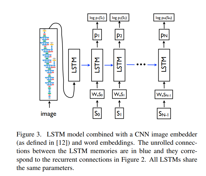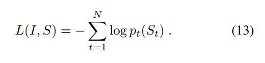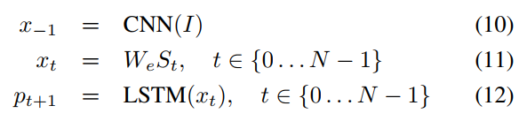 I는 이미지, S = {S_0, S_1\dots,S_N}는 이미지를 설명하는 문장, W_e는 워드 임베딩, S_t는 단어 사전의 크기와 동일한 차원인 원핫 벡터일 때 앞에서 설명드린 내용을 (10), (11), (12) 식으로 정리할 수 있습니다.