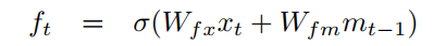 f_t는 어떠한 정보를 잊게 만들지를 결정합니다. 새로운 단어(x_t가 입력으로 들어오면서 앞전에 들어온 정보 중에 필요하지 않은게 있을 수 있습니다. forget gate를 통해서 오래된 정보 중에서 필요 없는 정보는 잊을 수 있도록 합니다.