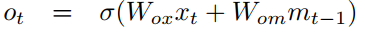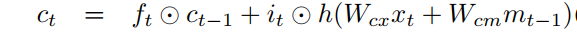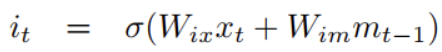i_t는 새로운 정보를 반영하는 역할을 합니다. (7)을 보시면 h(W_{cx}x_t + W_{cm}m_{t-1})을 확인할 수 있는데요. 보통은 h(W_{cx}x_t + W_{cm}m_{t-1})\tilde{C_t}로 표현하여 i_t와 함께 불립니다. 장기 기억(cell state) C_tf_ti_t를 이용하여 업데이트 합니다.