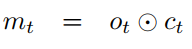 이렇게 장기 기억(cell state)을 구했으면 o_t는 장기 기억과 현재 데이터를 이용하여 단기 기억(Hidden State, 여기서는 m_t)를 갱신합니다.