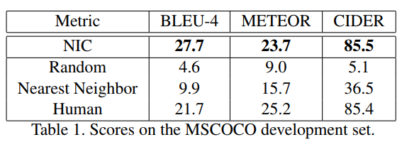 논문에서는 NIC를 통해 생성한 description을 평가하기 위해 사람이 평가하는 방법 외에는 100% 성능을 평가할 metric가 부족하다고 말합니다. 이 때문에 논문에서는 여러 평가 metric를 이용하여 성능을 보였습니다.(BLEU, METEOR, CIDEr, recall@k을 사용함.) 주로 NLP에서 사용하는 평가 metric이기 때문에 이해를 돕기 위해 각 metric이 어떤 성능 지표인지 간단히 설명하고자 합니다.