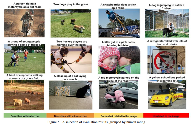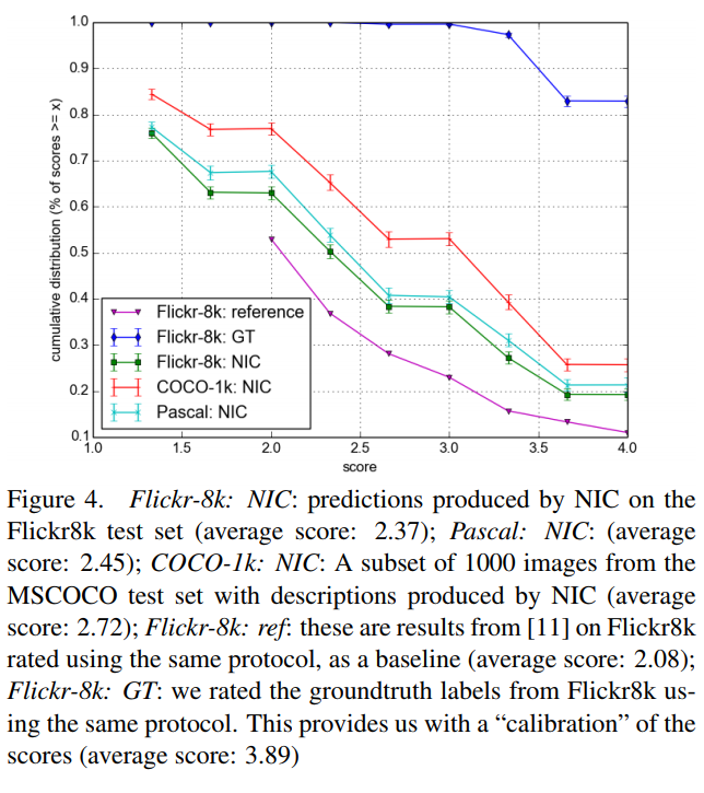 Figure 5에서는 사람이 평가한 것의 각 점수마다의 예제를 확인할 수 있습니다. 여기서 주목할 점은 2행 1열 이미지 입니다. frisbee(원반)이 이미지에서 굉장히 작은 부분을 차지하는데도 불구하고 NIC는 이를 가지고 caption을 만들었다는 것을 확인할 수 있습니다.