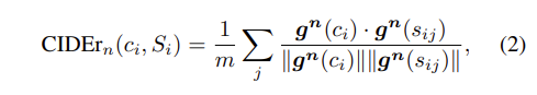이후에는 모델이 생성한 문장(candidate sentence)과 이미지를 설명하는 문장(reference sentence)간의 코사인 유사도의 평균을 구합니다. (식 (2) 참고)