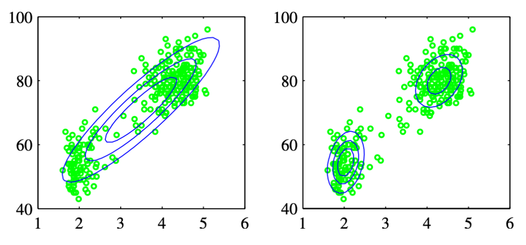 오른쪽 사진을 보면 전체 데이터의 분포를 두개의 가우시안 분포로 근사하여 설명하고 있습니다. 앞서서 하나의 분포로만 설명한 것에 비해 이번에는 데이터 분포를 그럭저럭 잘 설명할 수 있을 것 같습니다.