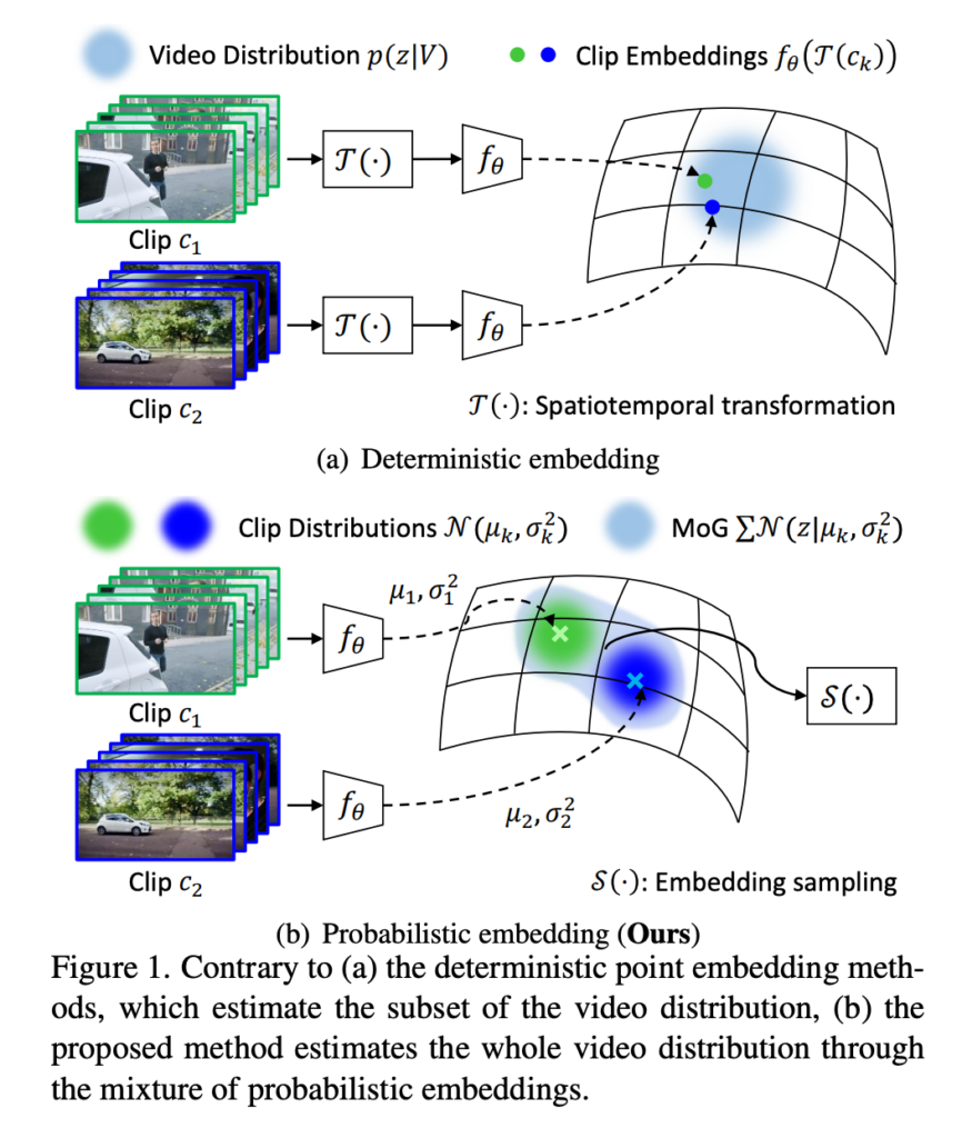 이전의 연구들 deterministic embedding 방식은 비디오 클립을 하나의 벡터로 projection하여 embedding space 내에서 정확히 하나의 point로 mapping 시킵니다. 하지만 본 논문에서 제안하는 probabilistic embedding 방식은 비디오 클립을 가우시안 분포로 projection하여 embedding space내에서 존재하는 확률 분포로 mapping 시킵니다. 그리고 클립들이 모여 구성되는 비디오를 가우시안 혼합 모델로 근사시키는 것이죠.