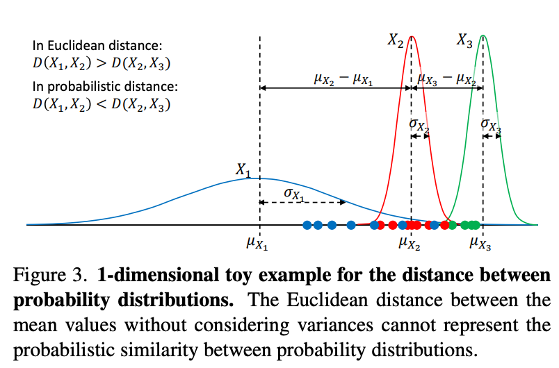 X_{2}는 X_{1}과 겹치는 구간이 더 많기 때문에 X_{3}에 비해 X_{1}과 더 유사하다고 볼 수 있습니다. 그런데 보통 많이 사용하는 평균간의 Euclidean distance는 이러한 유사도 관계를 보장해주지 못합니다. 따라서 저자는 Bhattacharyya distance를 통해 평균과 분산을 동시에 고려하여 두 확률 분포간의 유사도를 정의합니다.
