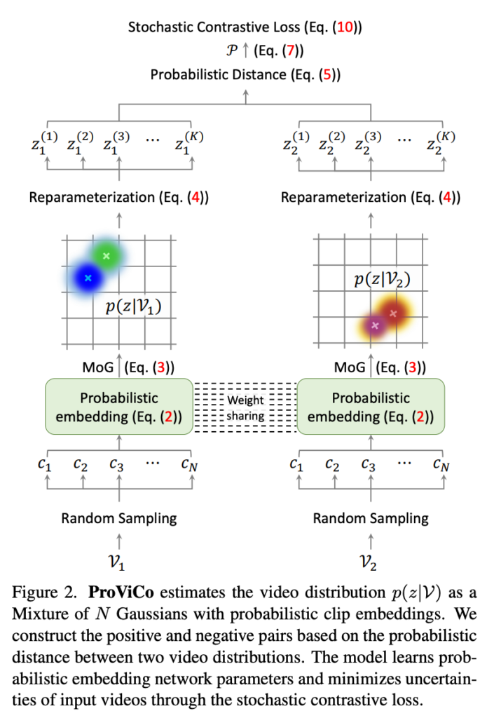 서로 다른 비디오간의 semantic-relation은 고려되지 않았다는 것 역시 한계로 작용합니다. 결국 저자는 앞서 설명한 한계점을 극복하기 위해 비디오 클립 자체를 확률 변수로 사용하는 stochastic embedding space를 제안합니다. 결국 비디오는 여러개의 가우시안 분포의 혼합 모델로써 혼합 분포를 가지게 되고 이러한 서로 다른 비디오 즉, 서로 다른 혼합 분포들끼리의 확률 거리(probabilistic distance)를 통해 positive, negative pair를 구성합니다.