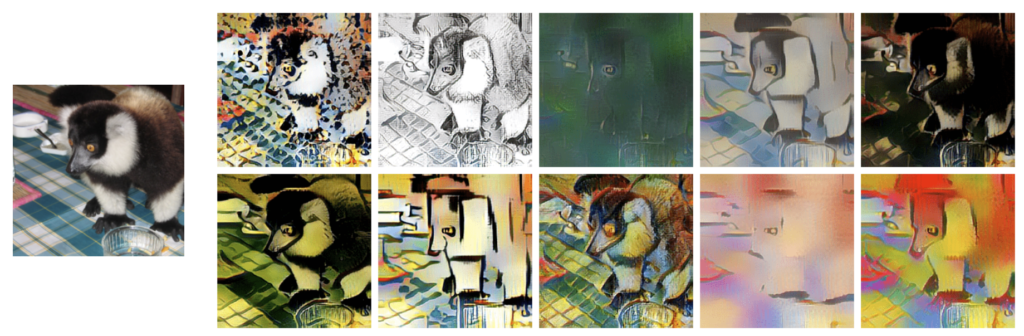 결과적으로 논문에서 주장하고자 하는 것은 한가지, 기존의 일반적인 영상으로 학습한 CNN들은 texture에 편향되었으며, 이를 shape에 편향되도록 해야만 강건하게 동작한다는 것입니다. CNN이 texture 편향되었다는 대표적인 예시 중 또 한가지는 아래 그림과 같이 영상에 style(texture)를 입히는 style transfer 분야에서 CNN을 활용하면 영상을 잘 생성하는 반면에 Image to Image Translation과 같이 Content image의 shape을 잘 유지하면서 style을 변경하고자 하면 생성된 영상의 shape이 많이 손상되는 것을 볼 수 있습니다.