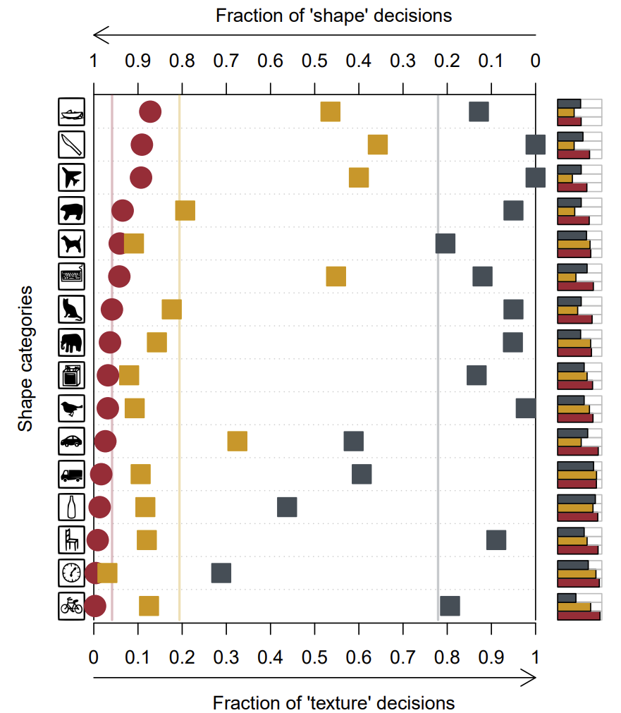 흥미로운 점은, 동일한 Resnet-50 모델이라 할지라도 SIN 데이터 셋으로 학습한 모델(겨자색 네모)의 경우 대부분의 카테고리들이 shape에 편향되어 있는 것을 확인하실 수 있습니다. 즉 기존의 모델들이 texture에 편향되었던 이유는 모델의 문제가 아닌 데이터 셋에 문제라고 저자는 주장하는 것이지요.