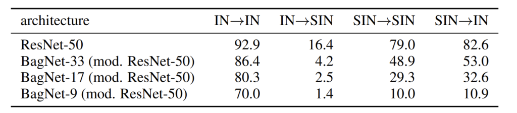 반면에 IN-SIN 성능은 상당히 처참한 결과를 보여줍니다. 이는 SIN은 global shape을 보지 않는 이상 정확한 분류가 불가능한 상당히 어려운 데이터셋임을 한번 더 증명하는 셈입니다. 상대적으로 큰 receptive field를 가지는 BagNet-33의 경우에는 SIN으로 학습해서 SIN으로 평가하는 경우 상대적으로 48.9라는 성능을 달성했지만 이는 Resnet-50과 비교하면 한참 모자른 성능일 뿐더러 Receptive field가 17, 9로 떨어질수록 성능의 드랍 역시 매우 크게 증가하는 것을 확인하실 수 있습니다.