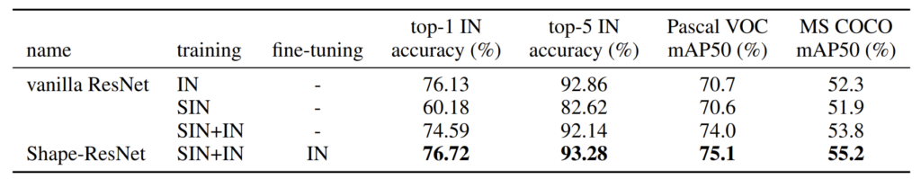 또한 SIN과 IN을 모두 섞어서 학습시킬 경우에는 IN으로만 학습시켰을 때와 비교해서 무려 pascal에서는 3.3%의 mAP 성능 향상을 보여줍니다. fine-tuning까지 진행한 경우에는 4.4%까지 성능 향상이 있는 모습이네요. 저자는 이러한 결과를 토대로 classification 분야보다는 실제로 객체를 검출할 때 bounding box 내의 객체의 shape을 잘 봐야하는 detection task에서 shape biased model이 더 큰 효과를 볼 수 있었다고 주장합니다.