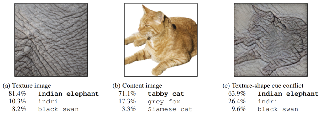 이러한 그림 한장이 논문에서 주장하고 싶은 모든 내용을 담았습니다. 해당 논문은 이미지넷으로 학습한 CNN은 모두 텍스처에 편향되어서 물체를 인식한다는 것입니다. 사실 CNN이 물체를 어떻게 인식하는가에 대해서는 많은 연구자들이 관심있어 했습니다. CNN이 영상의 어느 부분을 확인하는지를 알게 된다면, 성능은 우수하지만 그 과정 자체는 해석할 수 없는 블랙박스였던 CNN을 이해할 수 있는 첫걸음이라고 생각했기 때문이죠.