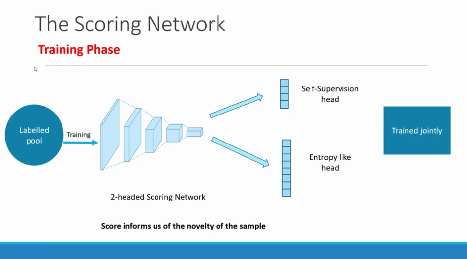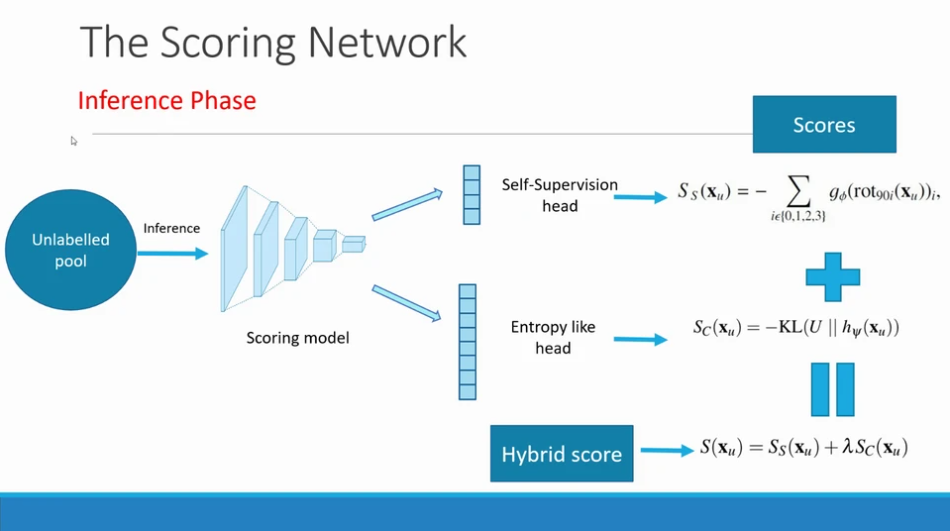 Scoring Network는 Multi-task Network로 두 개의 헤드로 구성되어 있다고 하였습니다. 나머지 두번째 Head가 바로 Classification head 입니다. Labeled Data를 사용하여 지도학습 기반으로 학습하는 네트워크가 되겠죠. 보통 active Learning 에서는 이 classification head만을 사용하여 데이터의 가치를 판단하고는 합니다. 그러나 저나는 멀티 태스크 러닝을 사용함으로써 소량의 데이터를 학습하였을 때 가질 수 있는 한계를 네트워크 Regularization으로 극복할 수 있었다고 합니다. 또한 회전 대칭을 가지는 이미지와 같은 특정 종류의 이미지에 대한 ScoreS_S가 가지는 비신뢰성을 완화하는 데에도 도움이 되기도 합니다.
