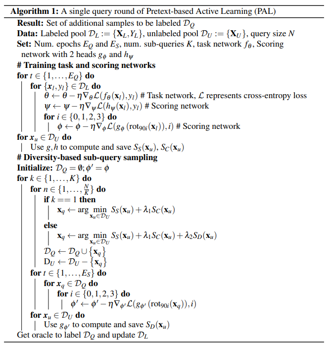 이렇게 PAL에 대한 과정을 알고리즘으로 정리하면 아래와 같습니다. 다소 복잡해보이지만, 생각보다 간단한 방법으로 SSL과 AL을 혼합하였다는 생각이 듭니다.