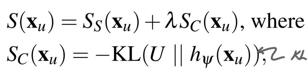따라서 저자는 두 개의 헤드를 가지는 Scoring Network를 학습시켜서, 데이터의 가치를 점수화할 수 있도록 하였습니다. 따라서 Classification head의 output에 대하여 KL divergence를 두번째 Score S_C로 사용하였습니다. 그리고 이렇게 구한 S_C 와 S_S를 더하여 데이터의 가치를 평가하는 점수를 구할 수 있었다고 합니다. 아래 수식이 데이터의 가치를 판단하는 Score S에 대한 수식입니다. 아래 수식에서 h_\psi 는 Classification 헤드에 대한 네트워크가 되겠습니다!