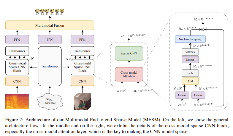 논문의 저자들은 이러한 단점을 보완하기 위해서 Multimodal End-to-end Sparse Model (MESM)을 제안합니다. 이후에 자세히 설명드리겠지만, MESM은 sparse cross-modal attention mechanism과 sparse CNN으로 구성되어 있습니다. 이를 통해 task에 가장 관련된 feature를 선택하고 불필요한 information과 noise를 줄일 수 있습니다.
