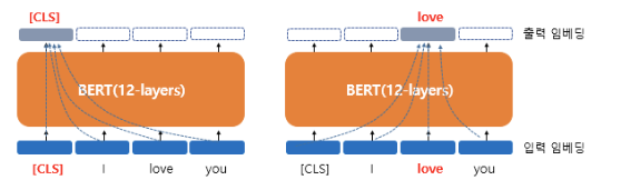 BERT의 연산을 거친 후의 출력 임베딩은 문장의 문맥을 모두 참고한 문맥을 반영한 임베딩이 됩니다. [CLS] 벡터는 BERT의 초기 입력으로 사용되었을 때 입력 임베딩 당시에는 단순히 임베딩 층(embedding layer)을 지난 임베딩 벡터였지만, BERT 벡터를 지나고 나서는 [CLS], I, love, you라는 모든 단어 벡터들을 참고한 문맥 정보를 가진 벡터가 됩니다.