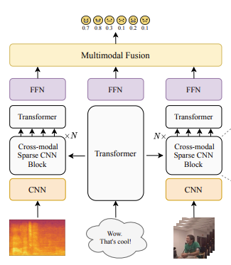 Cross modal attention layer이후에 sparse CNN을 사용합니다. 감정 인식 할때 데이터의 일부만 감정 인식만 관련이 있다고 가정하는데 이러한 점이 sparse setting과 일치한다고 합니다. sparse CNN이 cross modal attention layer의 output을 받고 active position에 대해서만 convolution 연산을 수행합니다. 이를 통해 연산량을 굉장히 줄일 수 있는데, 이론적으로 연산량을 구하면 표준 컨볼루션의 경우 z^2mnFLOPs가, sparse 컨볼루션의 경우, amn FLOPs가 나온다고 합니다. (여기서 z는 커널 사이즈, m은 input channel 수, a는 active points의 수 입니다)