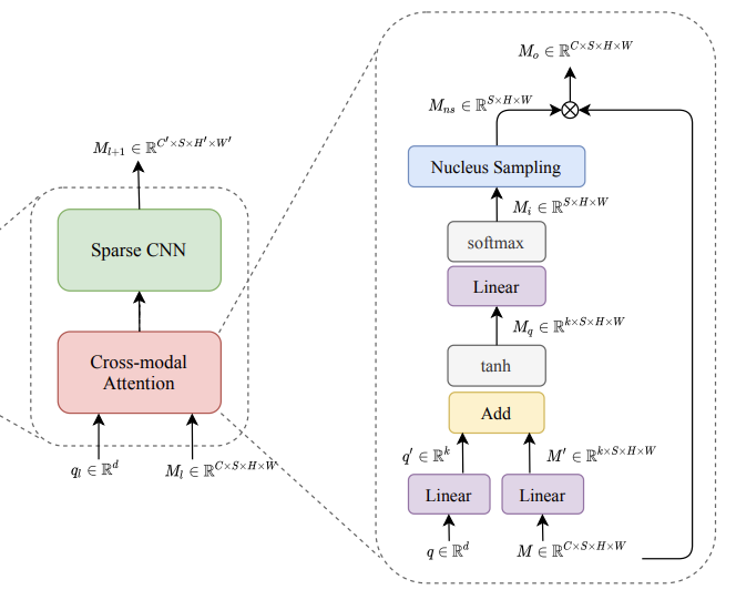 cross-modal sparse CNN 블럭은 cross modal attention layer과 sparse CNN으로 구성되어 있습니다.